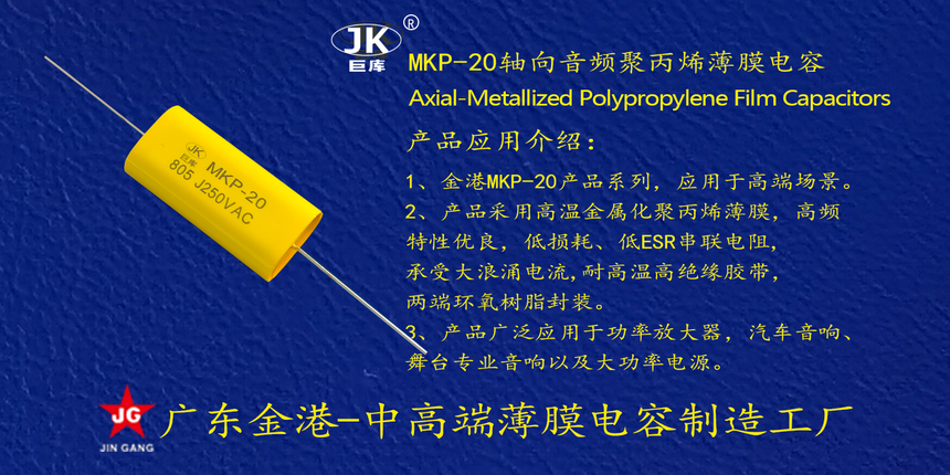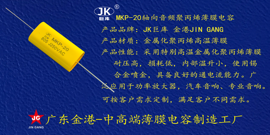 産品(pin)品牌 :JK巨(jù)庫金港(gǎng)JINGANG 産品材(cai)質: 金屬(shǔ)化聚丙(bǐng)烯高溫(wēn)薄膜 産(chan)品性能(néng): 采用高(gao)溫金屬(shu)化聚丙(bing)烯薄膜(mo) 耐壓高(gāo),損耗低(dī),内部溫(wen)升小,使(shi)用錫合(he)金噴金(jin), 具備良(liáng)好的通(tong)電流能(neng)力。 産品(pin)作用: 廣(guang)泛應用(yòng)于功率(lǜ)放大器(qi),汽車音(yīn)響、專業(ye)音響。 定(ding)制加工(gōng) :可按客(kè)戶需求(qiú)定制,滿(mǎn)足客戶(hù)不同需(xu)求。