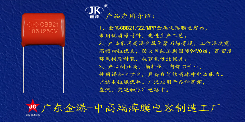 産品品牌(pai) :JK巨庫金港JINGANG 産品(pin)材質: 金屬化聚(jù)丙烯高溫薄膜(mo) 産品性能: 采用(yòng)高溫金屬化聚(ju)丙烯薄膜 耐壓(yā)高,損耗低,内部(bu)溫升小,使用錫(xī)合金噴金, 具備(bèi)良好的高脈沖(chòng)電流能力充放(fang)電性能優異。 産(chan)品作用: 廣泛應(ying)用于各種高頻(pín),直流,交流和脈(mo)沖電路中。 定制(zhi)加工 :可按客戶(hu)需求定制,滿足(zu)客戶不同需求(qiú)。