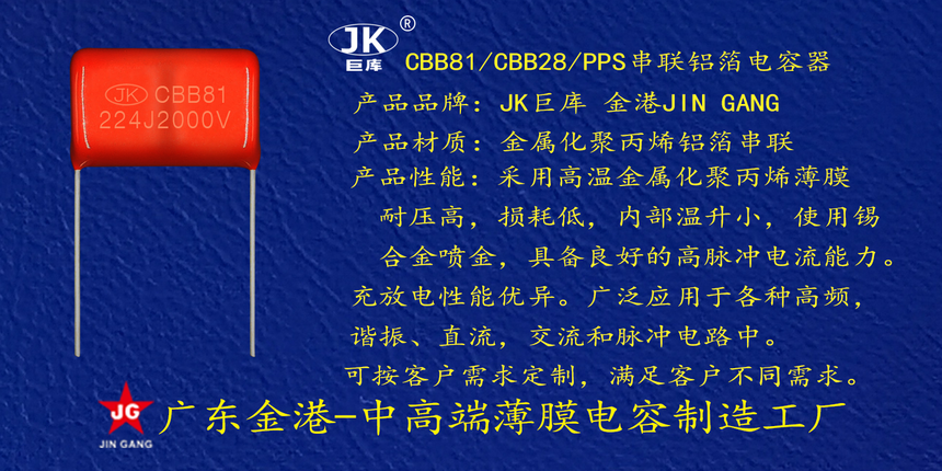 産品(pin)品牌 :JK巨(ju)庫金港(gǎng)JINGANG 産品材(cai)質: 金屬(shu)化聚丙(bǐng)烯高溫(wen)薄膜 産(chan)品性能(néng): 采用高(gāo)溫金屬(shǔ)化聚丙(bing)烯薄膜(mó) 耐壓高(gāo),損耗低(dī),内部溫(wen)升小,使(shi)用錫合(hé)金噴金(jin), 具備良(liang)好的高(gao)脈沖電(dian)流能力(li),充放電(dian)性能優(yōu)異。 産品(pin)作用: 廣(guǎng)泛應用(yòng)于各種(zhong)高頻諧(xie)振,直流(liú),交流和(hé)脈沖電(dian)路中⭐。 定(ding)制加工(gong) :可按客(kè)戶需求(qiu)定制,滿(mǎn)足客戶(hu)不同需(xū)求。