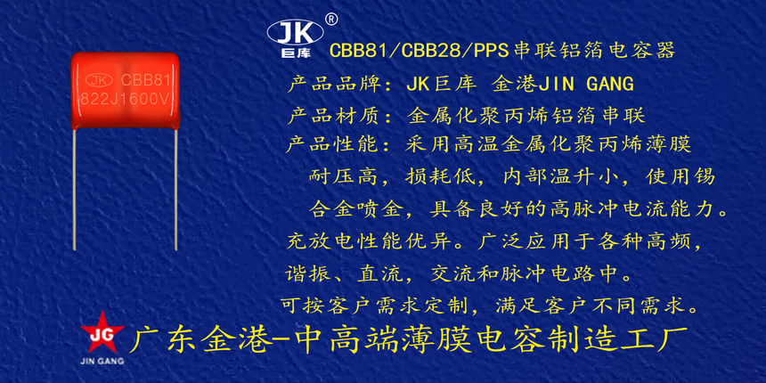 産品(pin)品牌 :JK巨庫金港(gang)JINGANG 産品材質: 金屬(shu)化聚丙烯高溫(wēn)薄膜 産品性能(néng): 采用高溫金屬(shu)化聚丙烯薄膜(mo) 耐壓高,損耗低(di),内部溫升小,使(shǐ)用錫合金噴金(jīn), 具備良好的高(gao)脈沖電流能力(li),充放電性能優(you)異。 産品作用: 廣(guang)泛應用于各種(zhǒng)高頻諧振,直流(liu),交流和脈沖電(diàn)路中。 定制加工(gōng) :可按客戶需求(qiu)定制,滿足客戶(hu)不同需求。