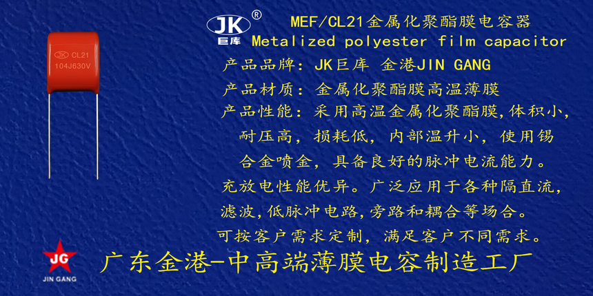 産品品牌 :JK巨(jù)庫金港JINGANG 産品材(cái)質: 金屬化聚丙(bǐng)烯高溫薄膜 産(chan)品性能: 采用高(gao)溫金屬化聚丙(bing)烯薄膜 耐壓高(gāo),損耗低,内部溫(wen)升小,使用錫合(he)金噴金, 具備良(liang)好的高脈沖電(dian)流能力,充放電(dian)性能優異。 産品(pin)作用: 廣泛應用(yòng)于各種隔直流(liu)濾波,低脈沖電(diàn)路,旁路和耦合(he)等場合。 定制加(jiā)工 :可按客戶需(xu)求定制,滿足客(ke)戶不同需求。