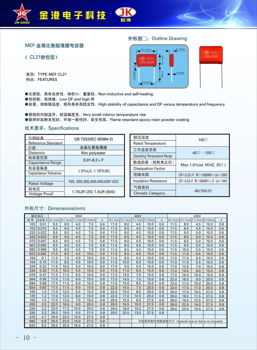 産品品牌(pái) :JK巨庫金港JINGANG 産(chan)品材質: 金屬(shu)化聚丙烯高(gao)溫薄膜 産品(pin)性能: 采用高(gao)溫金屬化聚(jù)丙烯薄膜 耐(nai)壓高,損耗低(dī),内部溫升小(xiao),使用錫合金(jin)噴金, 具備良(liang)好的高脈沖(chong)電流能力,充(chong)放電性能優(yōu)異。 産品作用(yòng): 廣泛應用于(yú)各種隔直流(liu)濾波,低脈沖(chong)電路,旁路和(he)耦合等場合(hé)。 定制加工 :可(kě)按客戶需求(qiú)定制,滿足客(kè)戶不同需求(qiú)。