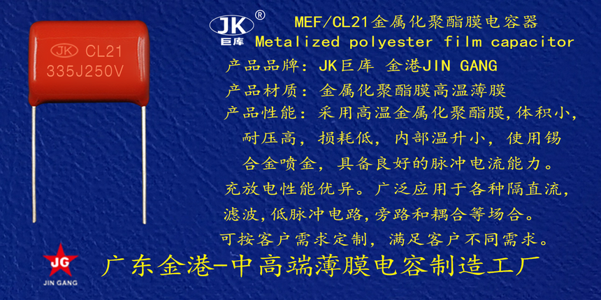 産品品(pin)牌 :JK巨庫金(jin)港JINGANG 産品材(cai)質: 金屬化(hua)聚丙烯高(gāo)溫薄膜 産(chǎn)品性能: 采(cǎi)用高溫金(jin)屬化聚丙(bǐng)烯薄膜 耐(nai)壓高,損耗(hào)低,内部溫(wēn)升小,使用(yòng)錫合金噴(pēn)金, 具備良(liáng)好的高脈(mo)沖電流能(néng)力,充放電(diàn)性能優異(yì)。 産品作用(yong): 廣泛應用(yòng)于各種隔(ge)直流濾波(bō),低脈沖電(dian)路,旁路和(he)耦合等🛀場(chǎng)合。 定制加(jia)工 :可按客(ke)戶需求定(dìng)制,滿足客(kè)戶不同需(xū)求。