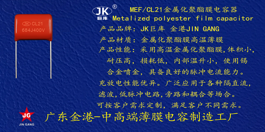 産品品牌(pái) :JK巨庫金港JINGANG 産(chǎn)品材質: 金屬(shu)化聚丙烯高(gāo)溫薄膜 産品(pin)性能: 采用高(gao)溫金屬化聚(ju)丙烯薄膜 耐(nài)壓高,損耗低(dī),内部溫升小(xiǎo),使用錫合金(jin)噴金, 具備良(liáng)好的高脈沖(chong)電流能力,充(chōng)放電性能優(yōu)異。 産品作用(yong): 廣泛應用于(yú)各種隔直流(liu)濾波,低脈沖(chong)電路,旁路和(hé)耦合等📱場合(he)。 定制加工 :可(ke)按客戶需求(qiu)定制,滿足客(ke)戶不同需求(qiu)。