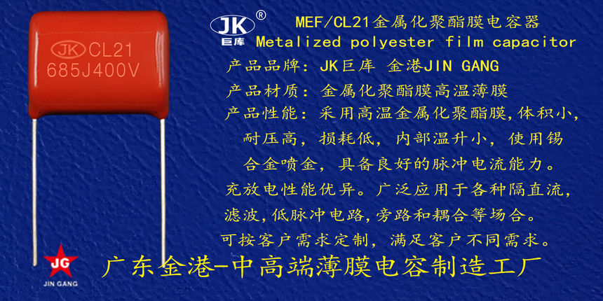 産品品牌 :JK巨(jù)庫金港JINGANG 産品材(cái)質: 金屬化聚丙(bǐng)烯高溫薄膜 産(chan)品性能: 采用高(gao)溫金屬化聚丙(bing)烯薄膜 耐壓高(gāo),損耗低,内部溫(wen)升小,使用錫合(he)金噴金, 具備良(liang)好的高脈沖電(dian)流能力,充放電(dian)性能優異。 産品(pin)作用: 廣泛應用(yòng)于各種隔直流(liu)濾波,低脈沖電(diàn)路,旁路和耦合(he)等場合。 定制加(jiā)工 :可按客戶需(xu)求定制,滿足客(ke)戶不同需求。
