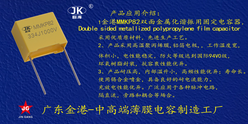 産(chan)品品牌 :JK巨(ju)庫金港JINGANG 産(chan)品材質: 雙(shuang)面金屬化(huà)聚丙烯,塑(su)料外殼封(fēng)裝 産品性(xing)能: 采用高(gao)溫雙面化(huà)聚丙烯,耐(nai)壓高, 損耗(hào)低,高頻條(tiáo)件下内部(bù)溫升小。錫(xī)合金噴金(jin), 具備良好(hao)的耐電流(liu)能力。充放(fang)電性能優(you)異。 産品作(zuo)用: 應用于(yú)高壓高頻(pin)脈沖電路(lù),諧振電路(lu),等場合。