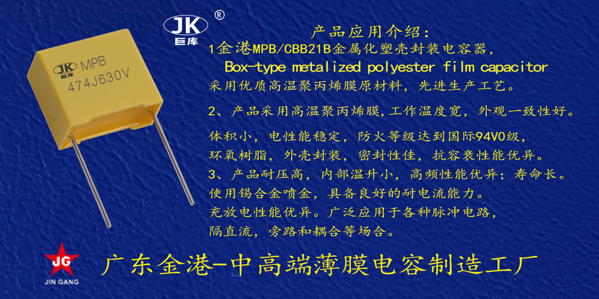 産品品(pǐn)牌 :JK巨庫金港(gang)JINGANG 産品材質: 高(gao)溫金屬化聚(jù)丙烯,塑料外(wài)殼封裝 産品(pin)性能: 采用高(gāo)溫金屬化聚(ju)丙烯,耐壓高(gao)産品一緻性(xing)好, 損耗低,内(nei)部溫升小。錫(xi)合金噴金, 具(ju)備良好的耐(nài)電流能力。充(chōng)放電性能優(you)異。 産品作用(yòng): 應用于高壓(ya)高頻脈沖電(dian)路,諧振電路(lu),等場合。