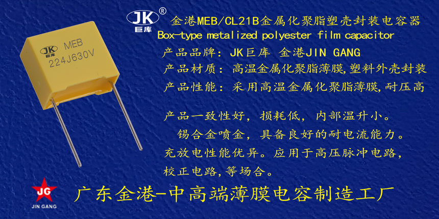 産品品牌(pai) :JK巨庫金港JINGANG 産品(pǐn)材質: 高溫金屬(shǔ)化聚脂薄膜,塑(su)料外殼封裝 産(chǎn)品性能: 采用高(gao)溫金屬化聚脂(zhi)薄膜,耐壓高
