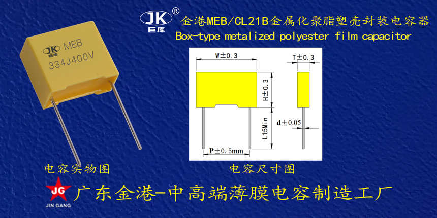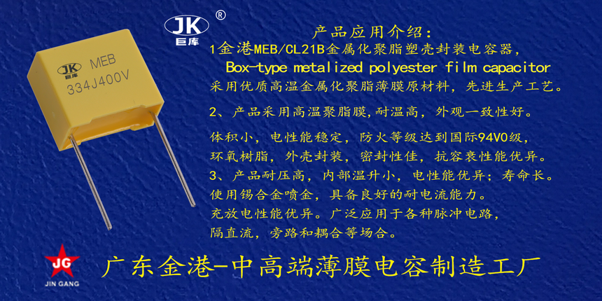 産品品(pǐn)牌 :JK巨庫金港JINGANG 産品(pin)材質: 高溫金屬化(hua)聚脂薄膜,塑料外(wai)殼封裝 産品性能(néng): 采用高溫金屬化(huà)聚脂薄膜,耐壓高(gao)